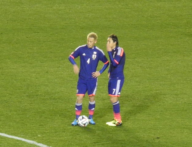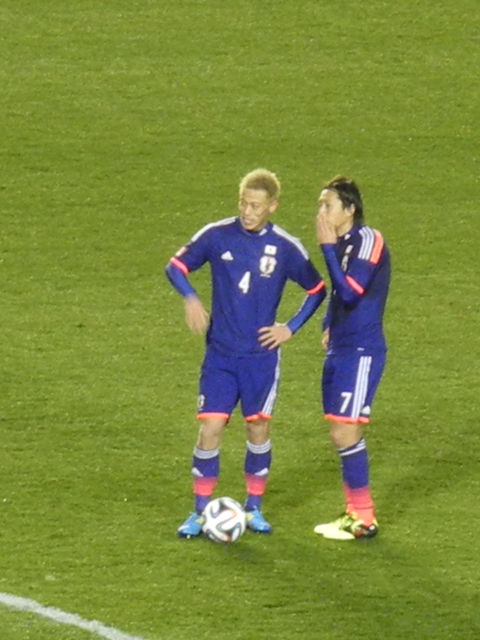 フリーキックを前に本田選手と遠藤選手。